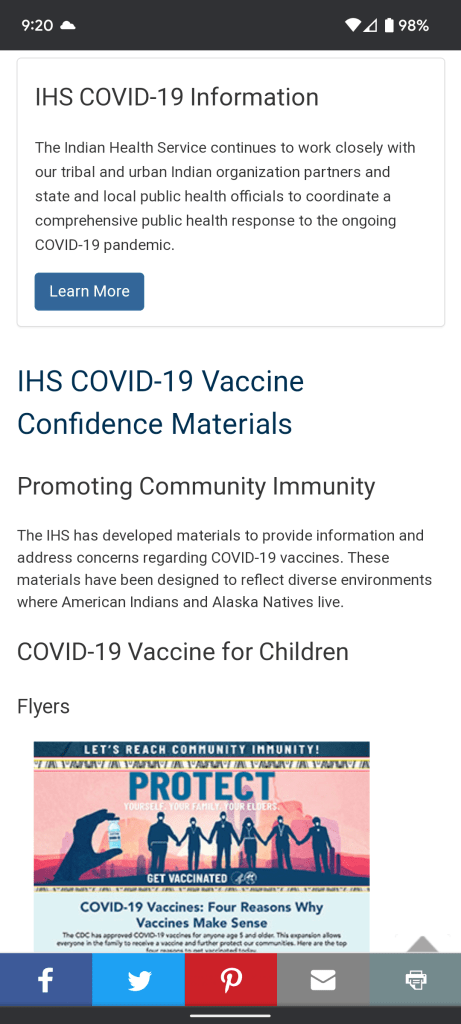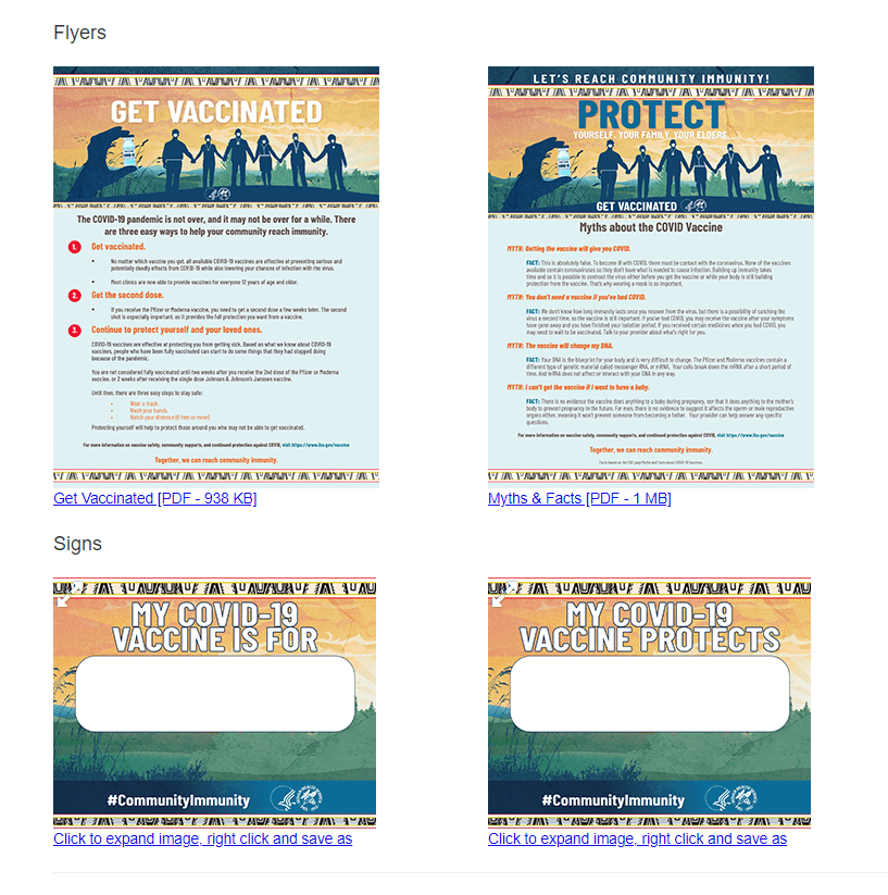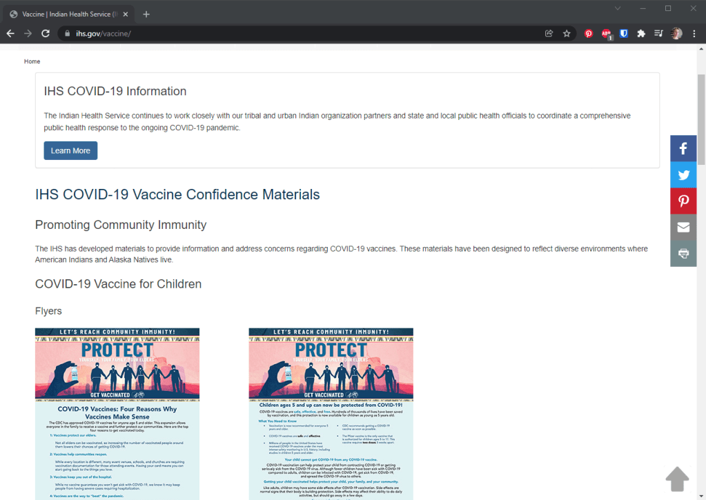 In addition to the main coronavirus site, Public Affairs wanted a simple single-page layout with vaccine promotion materials that tribes could print or share online.