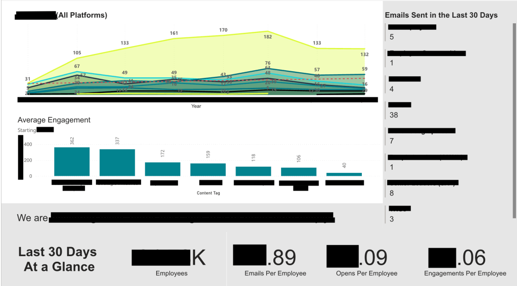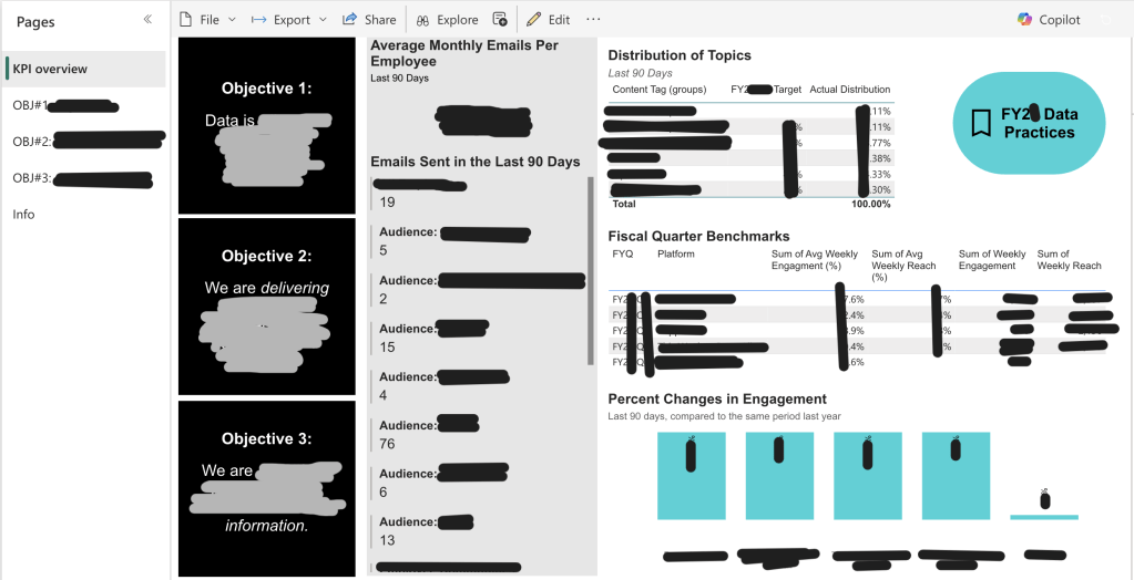 Each page has one of the objectives on it, along with key performance indicators. One page tracks overall email comms and creates aggregate calculations for emails/opens/engagements per employee over a running 30 days. The dashboard is designed to be useful for end of quarter reporting as well as running (last 90 days) data.