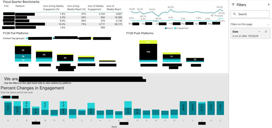 These dashboards are designed to be insightful on a high level for executives and move beyond basic metrics into strategy-tailored cross-platform analytics. Previous dashboards were prepped quarterly, but this dashboard allows for ongoing leadership engagement because it provides the quarterly results as well as on-demand last 90 days comparisons of the same metrics.