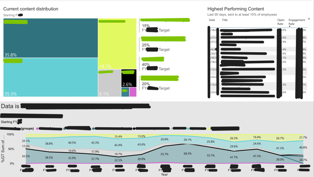 This dashboard aligns data from multiple sources to broad quarterly objective statements (example: our employees have many ways to access information; we are increasing cross-platform engagement).