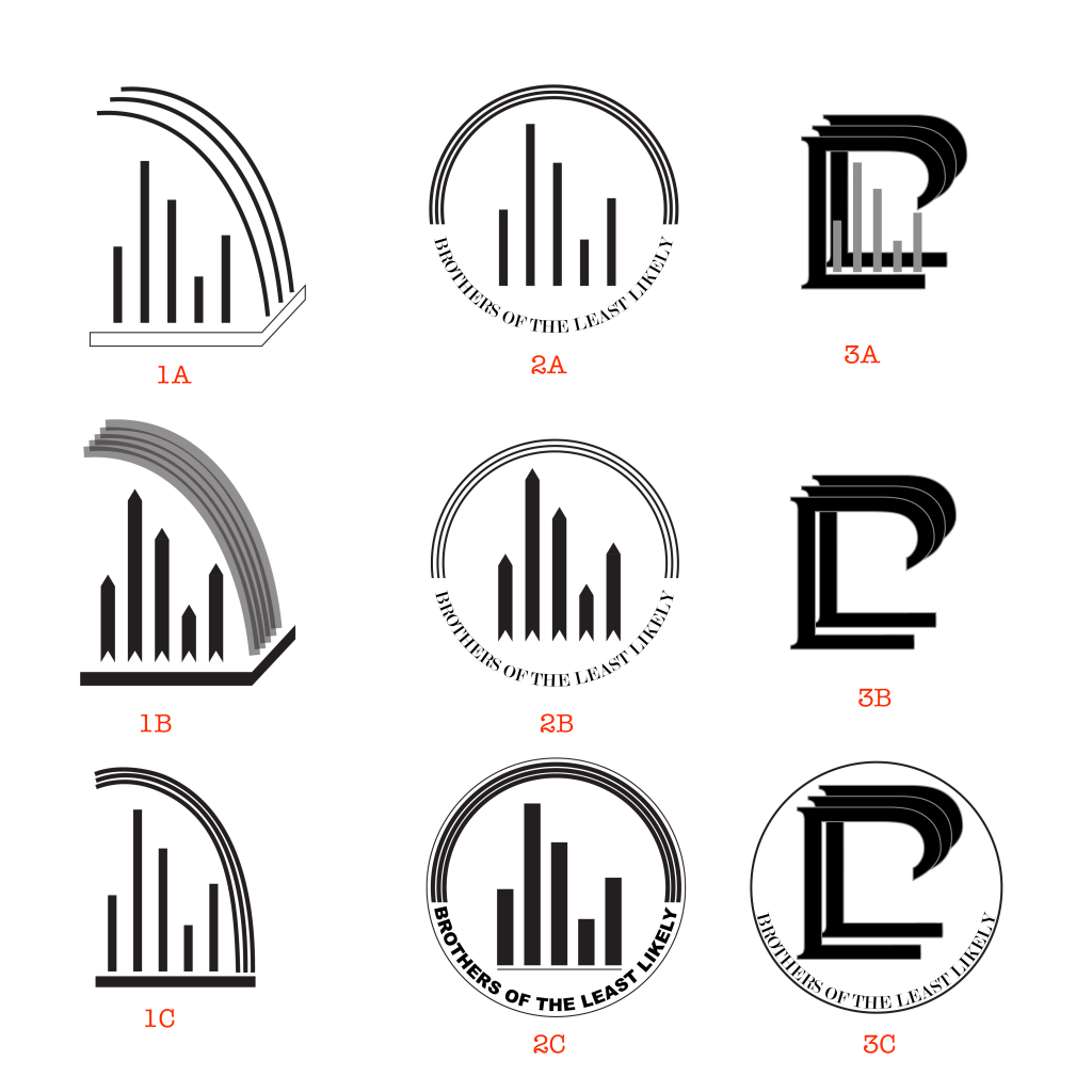 My initial proposal included three variations of three different styles of logos. The first style was a literal digital version of their sketches: five bars, a base, and three lines arcing over the group. I included 2d, 3d, and stylized versions of this logo. For the second style, I took the elements of their logo and turned it into a badge. Some of the logos that the group showed me as examples of what they liked were lettermarks, so for the third style I created a lettermark that involved combining the letter B (for brothers) with two Ls (for least likely). The top curves of the Bs form the rainbow from their original sketch.
