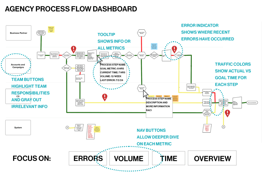 The visualization could be shifted to focus on errors (noted based on the step where they occurred), time, or volume. Team buttons highlighted just the steps a given team was involved in without removing the rest of the dashboard data. Hover tooltips described the task, teams/responsibilities involved, goal metric, KPI, volume, and error rate.