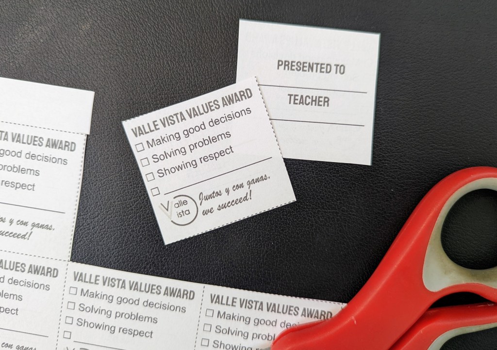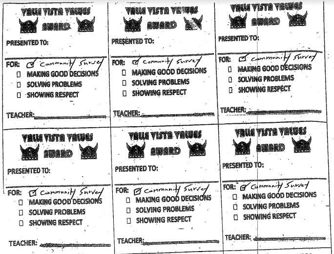The Valle Vista Values Award are used throughout the Community School to reward students for living out the community values. Teachers have been repeatedly copying an old printed version of the awards and cutting them out, but the old document was both difficult to read and inefficient, since students can receive up to 10 awards at a time but the old ones were 12 to a page.
