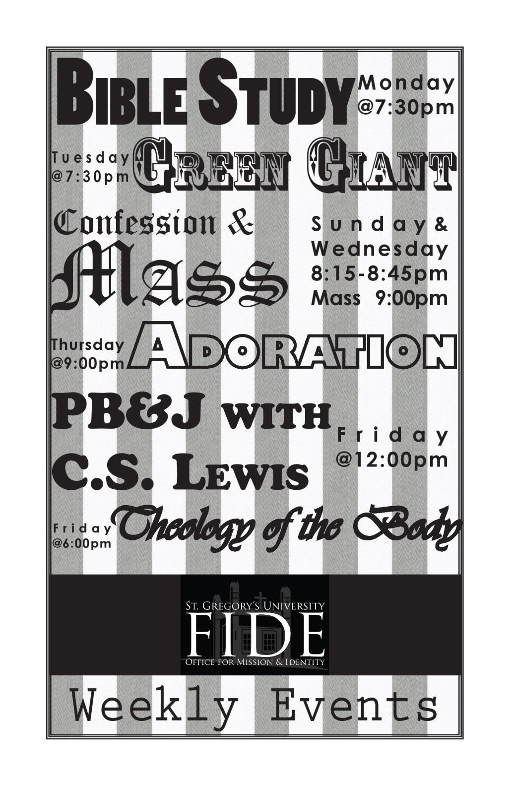 This is a half-sheet weekly calendar of events produced for the Campus Ministry office to hand out at New Student Orientation.