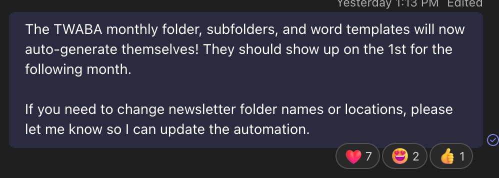 The assets for a weekly newsletter are stored in a nested file system with folders for the year, month, and week, and documents for each newsletter. Before I built this automation, someone had to spend a few hours once a month manually duplicating and renaming all of these items and ensuring they were in the appropriate locations.